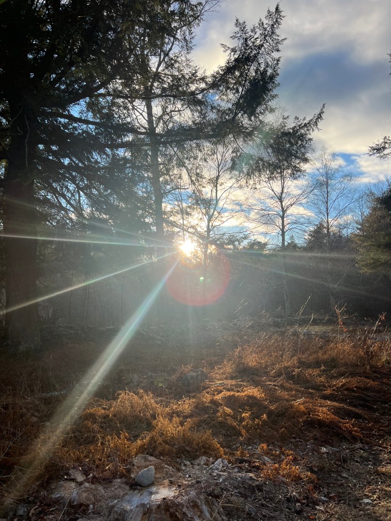 I sit at the table and listen to the strange sounds that come from the refrigerator. The dog is snoring. I look out the window; no color. I see shades of brown and grey in every direction. One moment there’s stillness and structure. The next minute the wind gusts and flows, moving the trees. The birds are eating and swooshing through the yard. As the clouds roll by, the sun furtively peeks through as if it’s scandalous to appear in winter.